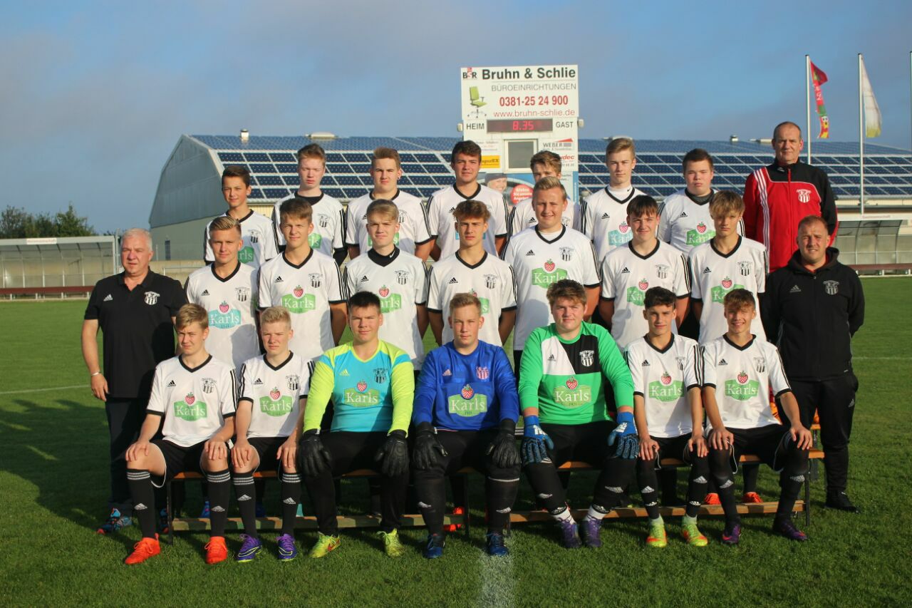 Unsere B-Junioren (U 17) spielen auch in der Saison 2017/18 in der Verbandsliga und damit in der höchsten Spielklasse von Mecklenburg-Vorpommern. Im vergangenen Jahr gewannen wir erstmals seit vielen Jahren wieder den Landesmeistertitel, und sind verdammt stolz darauf! Allerdings ist die Mannschaft völlig neu formiert. Die Trainer Ralph Gerlach und Enrico Kiss, der mit vielen C-Junioren eine Altersklasse aufgerückt ist, haben einen 24-Mann-Kader zusammengestellt. 13 Spieler gehören dem jungen Jahrgang (2002) an, darunter die Neuzugänge Lennox Kleinow, Götz Borgmann, Eddie Warnick und Max Härting. Geblieben sind die Landesmeister Georg Ahnfeldt, Moritz Backhaus, Ben Brümmer, Raik Gerlach, Dominik Schwarz, Paul Hilbrecht, Florian Vitow und Jan-Thorben Hübner (alle Jahrgang 2001). Ebenfalls neu im Aufgebot sind Fritz Drews, der neue Kapitän Karl Grumbach und Conrad Lehmann (alle vom SV 47 Rövershagen, 2001).