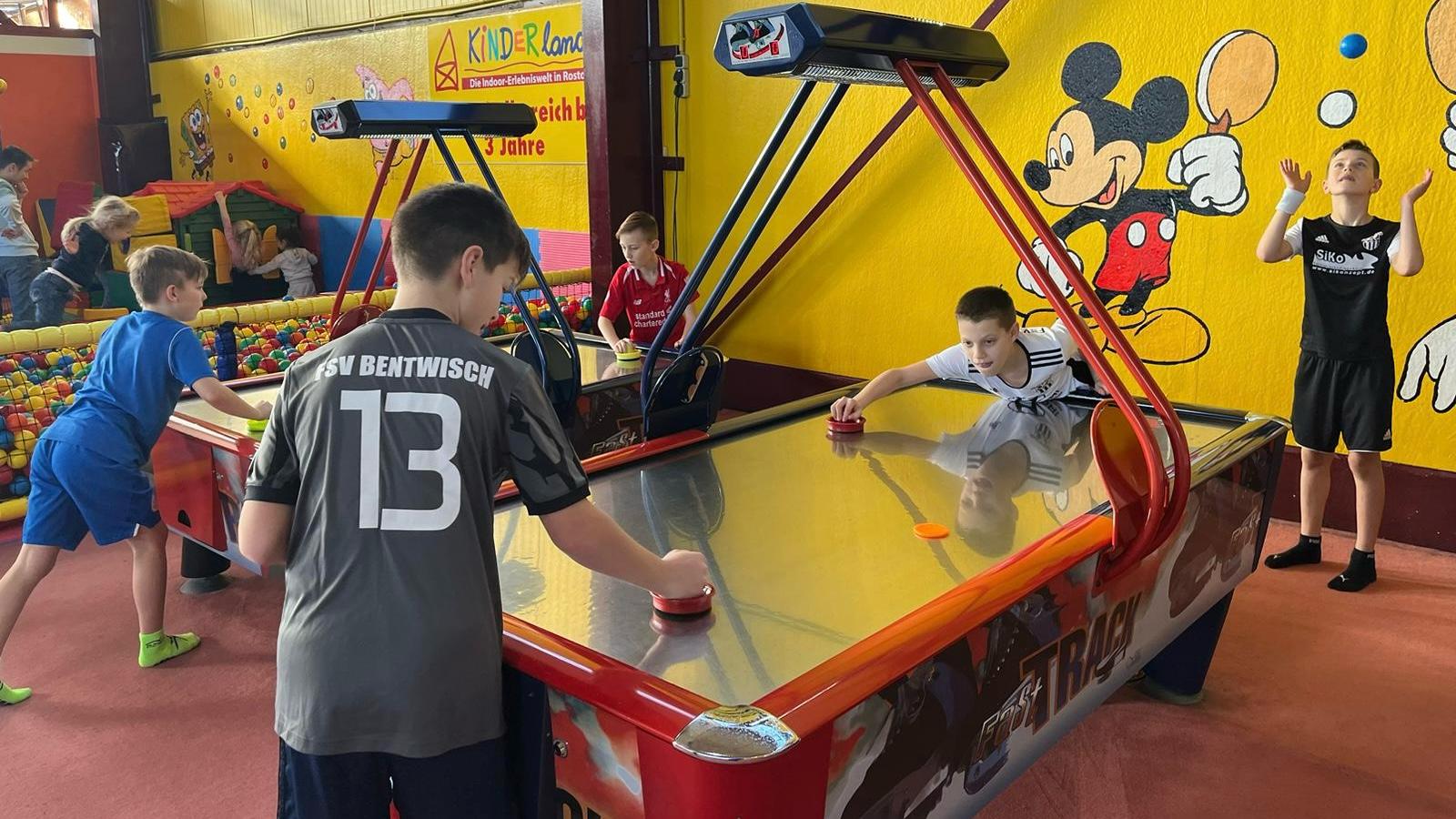 Beim Fußball- und Fangespielen kam der FSV-Nachwuchs ordentlich ins Schwitzen. Auch die Trainer wurden mehrfach im Kicker-Käfig und am Airhockey-Tisch herausgefordert. Im Anschluss wurde sich noch beim gemeinsamen Mittagessen gestärkt.