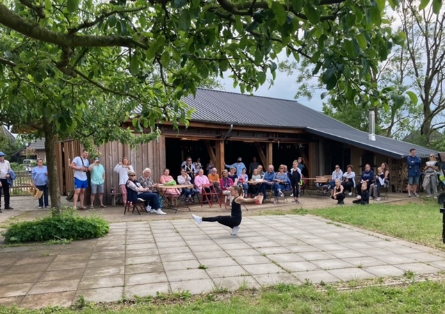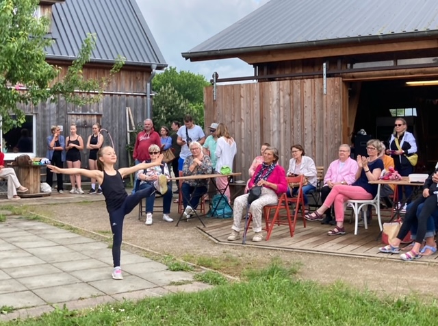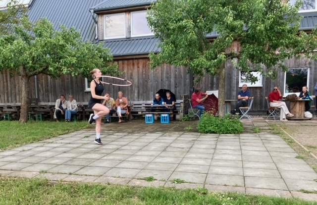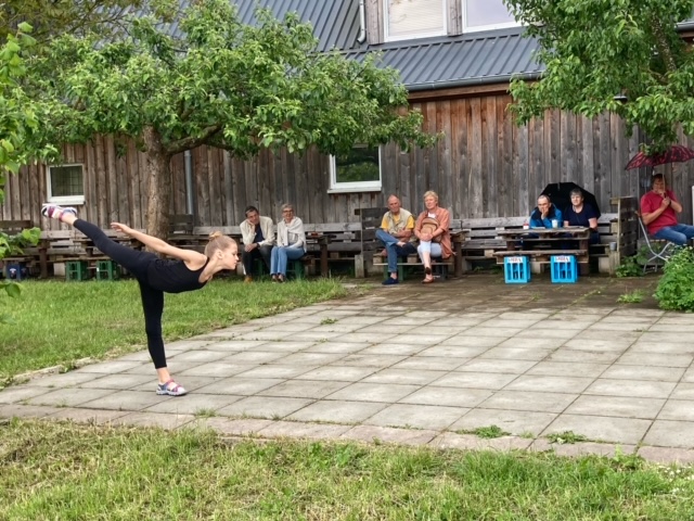 Bei sehr wechselhaftem Wetter und lockerer Atmosphäre war der Auftritt im Bio24 - Café und Dorfladen eine schöne Abwechslung zum Training. Bei kleiner Fläche, Steinboden, Wind und teilweise Regen war Improvisation gefragt, was alle Mädchen so gut meisterten, dass unmittelbar nach dem Auftritt eine neue Anfrage zum nächsten Auftritt in Rostock kam.