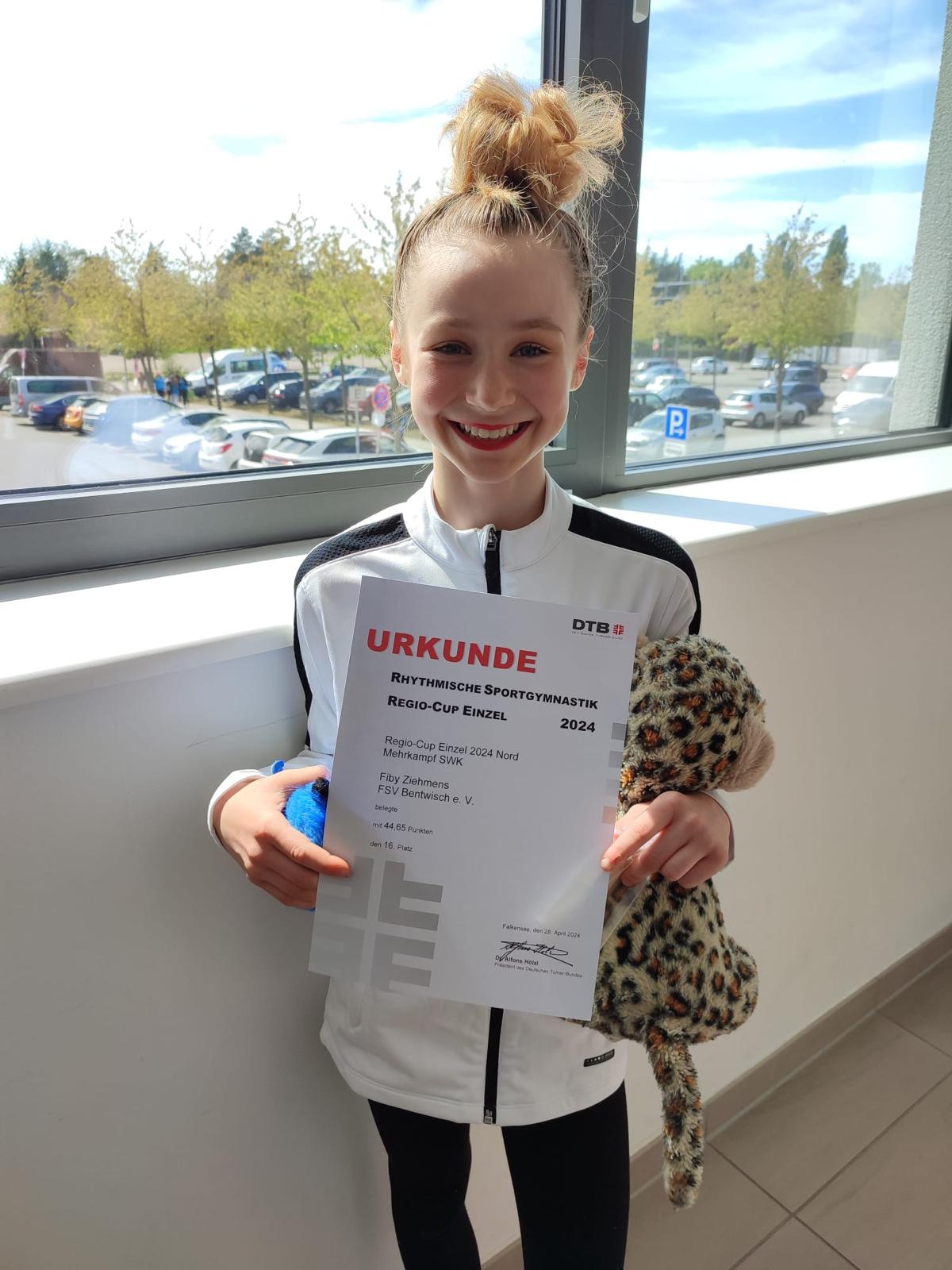 In der Reifenübung verlor sie leider einmal den Reifen. Insgesamt schaffte Fiby trotz Aufregung einen stabilen Wettkampf zu turnen und platzierte sich auf Platz 16.